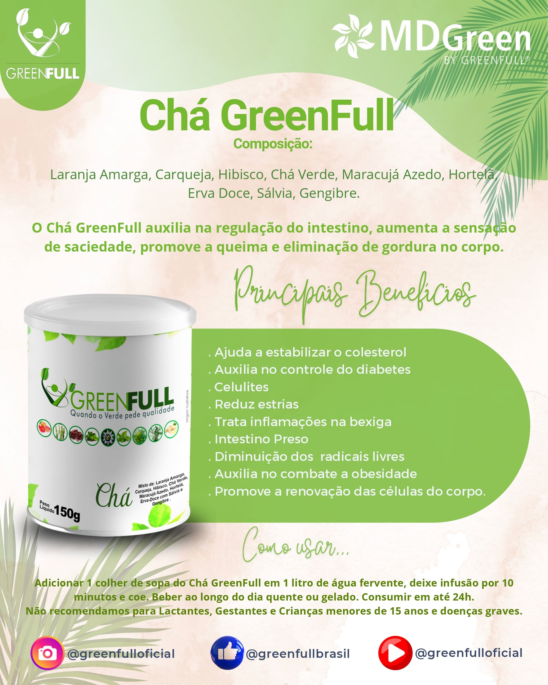 O chá Greenfull auxilia na regulação do intestino, aumenta a sensação de saciedade, promove a queima e eliminação de gordura no corpo.